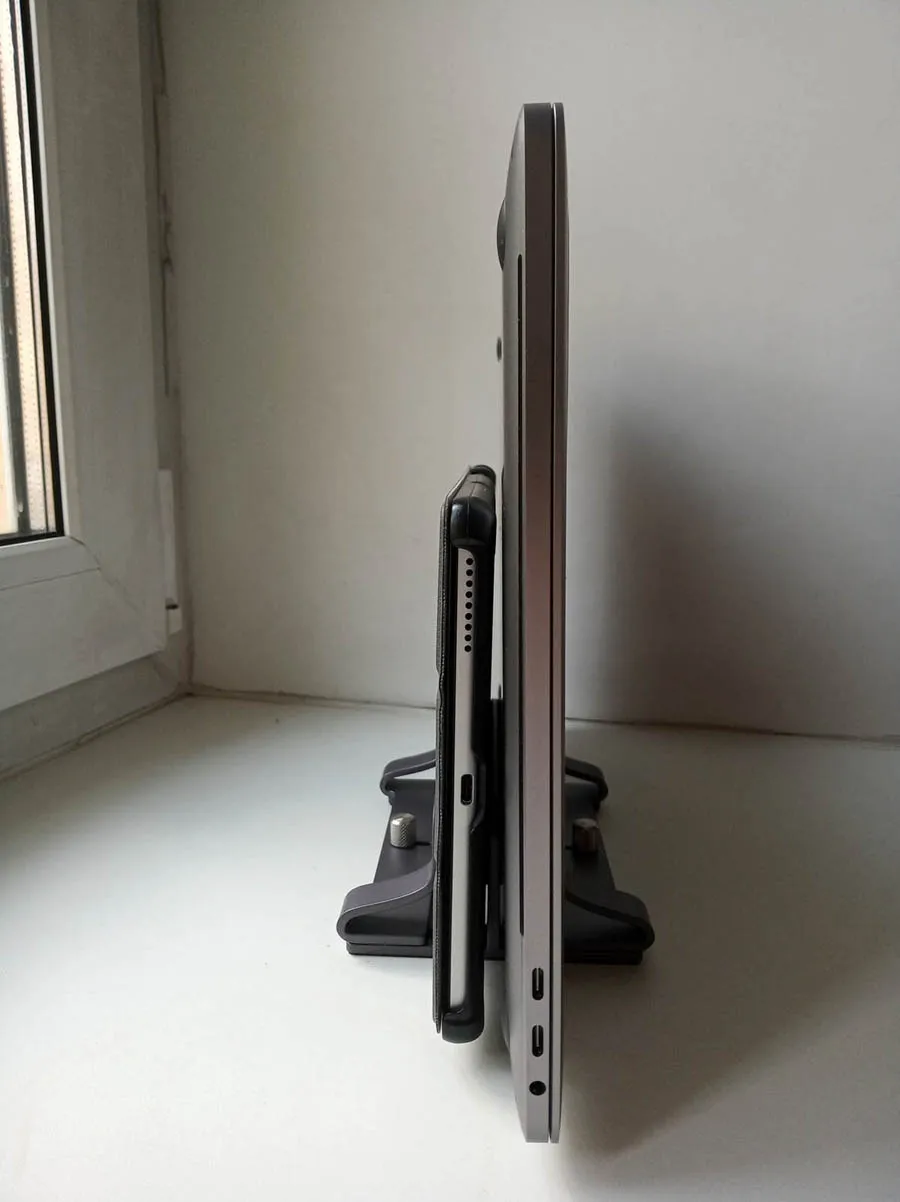 Доставили супер быстро - всего два дня! До этого заказывал подставку с одним отсеком. С двумя отсеками темнее по цвету. И в исполнении немного отличается. Подставкой доволен. На фото MacBook Pro 16' и планшет 10'. Магазин рекомендую.